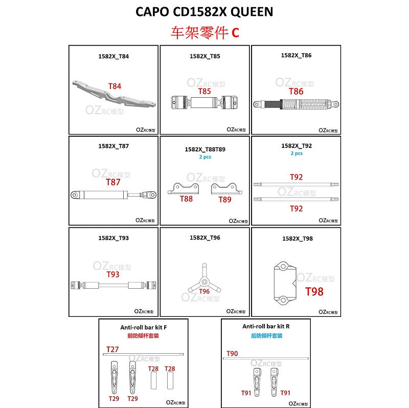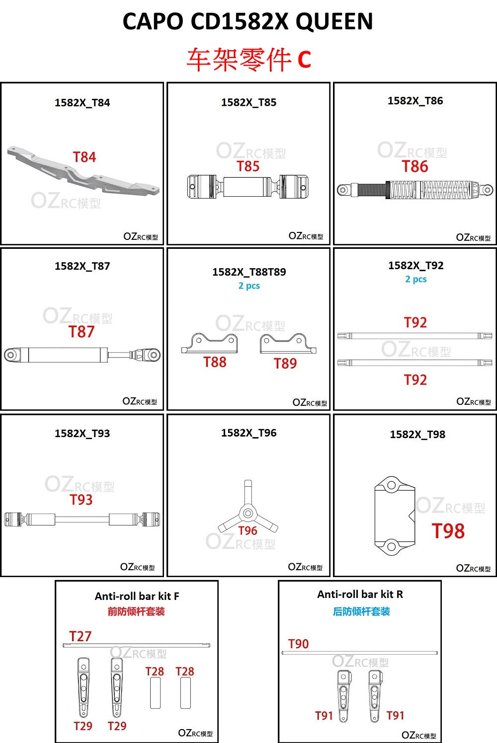Color classification: T84, T85, T86, T87, T88T89 pair, T92 pair, T93, T96, T98, front anti-tilt bar kit, rear anti-tilt bar kit