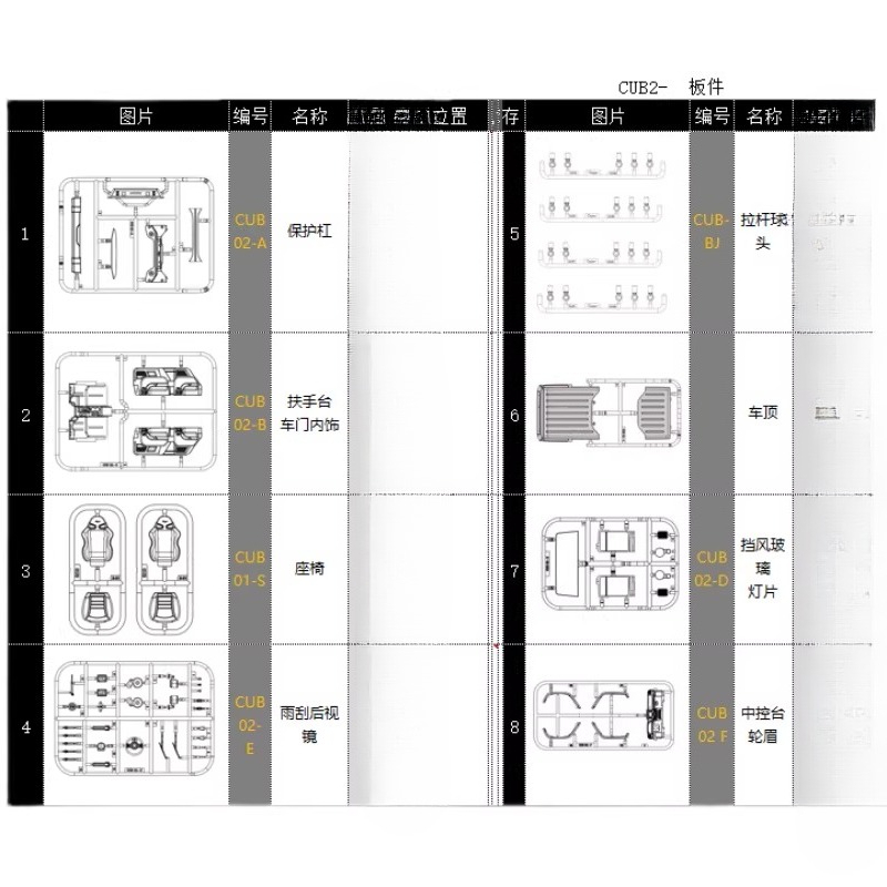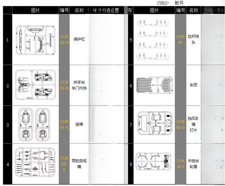 Color classification: bumper CUB02-A, armrest door interior CUB02-B, seat CUB01-S, wiper rearview mirror CUB02-E, tie rod ball head CUB-BJ, roof, windshield lamp CUB02-D, center console wheel eyebrow CUB02-F