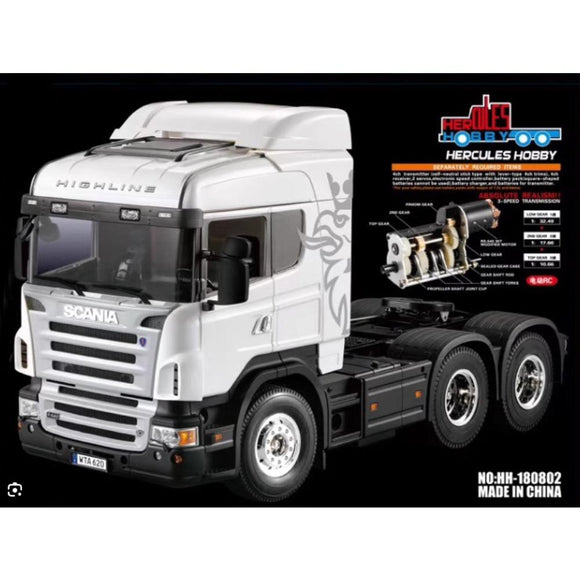 Hercules Hobby 1:14th scale radio controlled Scania R620 3 axle Prime Mover as per pictures. Truck is compatible with Tamiya Trailer Kits  and can be further enhanced by adding Hercules Hobbies upgrade paints.
