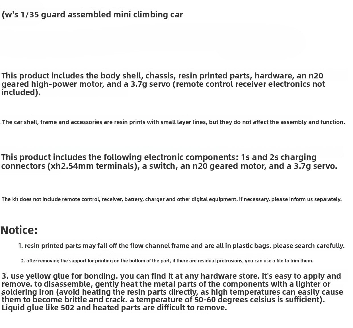 Note that this pnp is 3d printed, pnp included, frame, 3d printed car shell, esc, motor, steering gear, Lithium-ion battery,you need to prepare your own , remote control transmitter, receiver, the buyer must have very strong RC assembly experience, we cannot provide any instructions and installation help