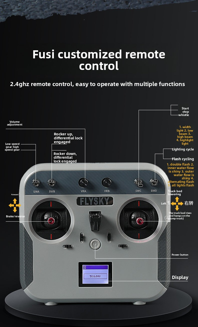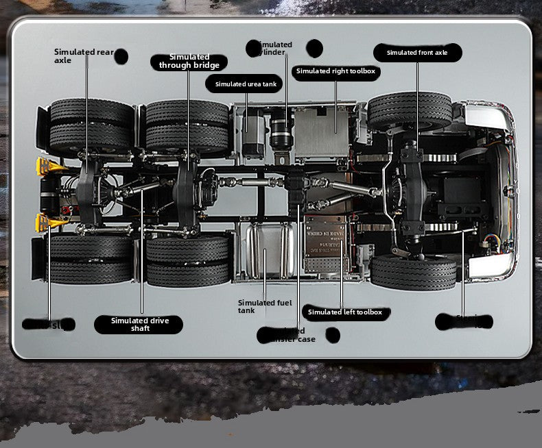 The chassis adopts the second gear transmission, 6X6 axle set,Differential lock, lights, sound, and the ability to open both the left and right cabs.